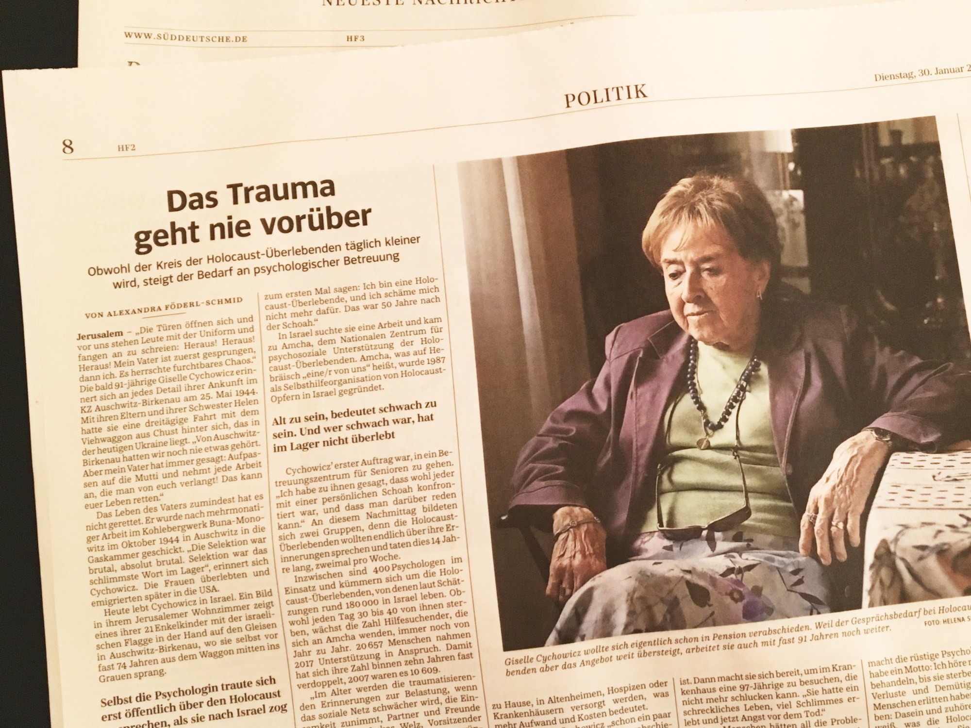 Über den neuen Höchststand in der psychosozialen Hilfe und für Überlebende des Holocaust durch AMCHA hat heute die Süddeutsche Zeitung berichtet. „Wir können für Verluste und Demütigungen, die diese Menschen erlitten haben, etwas zurückgeben: Dasein und zuhören.“ Im Mittelpunkt stand die wunderbare Giselle Cycowicz, Überlebende von Auschwitz und bis heute mit über 90 Jahren als Psychotherapeutin bei AMCHA in Israel aktiv.